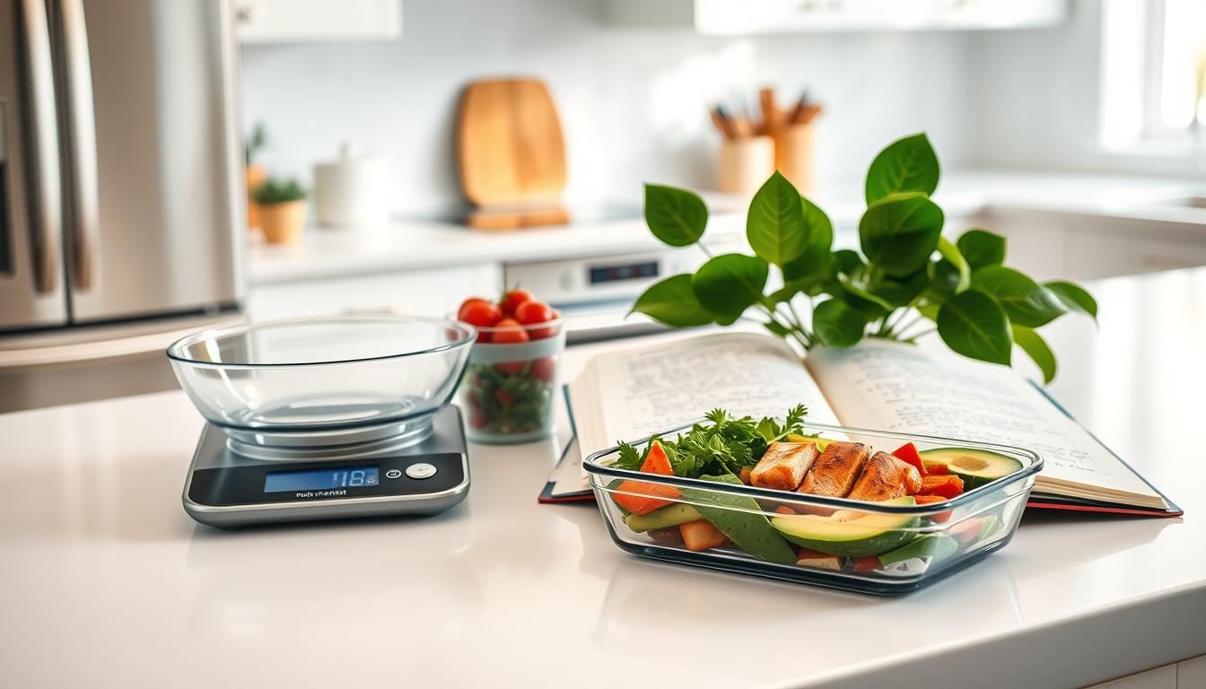 A well-lit, high-resolution image of a modern kitchen counter with a variety of low-carb keto-friendly ingredients and meal preparation tools arranged neatly. In the foreground, a sleek digital food scale and a clean glass meal prep container filled with a balanced keto macro-tracked meal, such as grilled salmon, roasted vegetables, and a side of avocado. In the middle ground, an open recipe book with handwritten notes on macro counts, and a vibrant green leafy plant for a fresh, natural accent. The background showcases a minimalist, light-filled kitchen with stainless steel appliances and clean white countertops, conveying a sense of organization and efficiency. The overall atmosphere is one of a well-planned, health-conscious keto lifestyle.